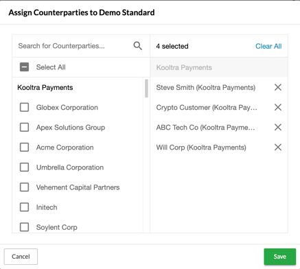 - Select counterparties by clicking the checkbox next to their names.