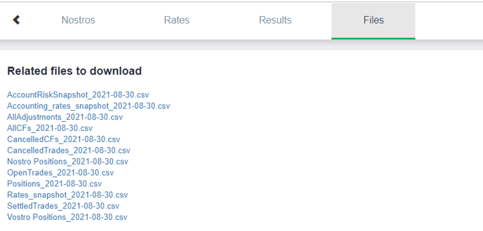 Files pertaining to the Daily reconciliation process can be accessed by navigating to the Files tab in the top menu of the Daily Reconciliation page.