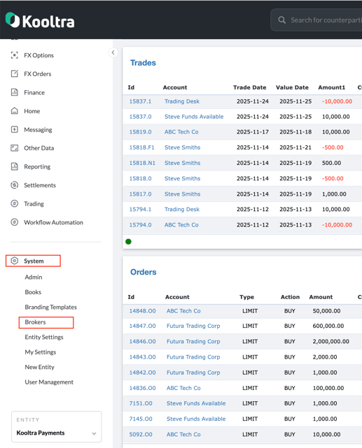 1.Navigate to System > Brokers in the Kooltra UI to access the broker page in the Salesforce backend.