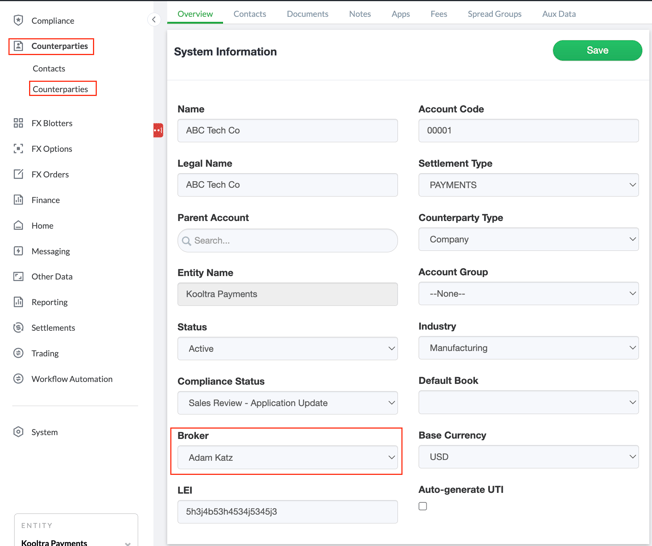 After adding the broker, navigate to the account overview page (Counterparties > Counterparties) to assign the broker as the owner of a client account.