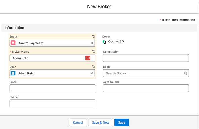 If the broker has an existing Kooltra user account, you can link this account in the User field.
