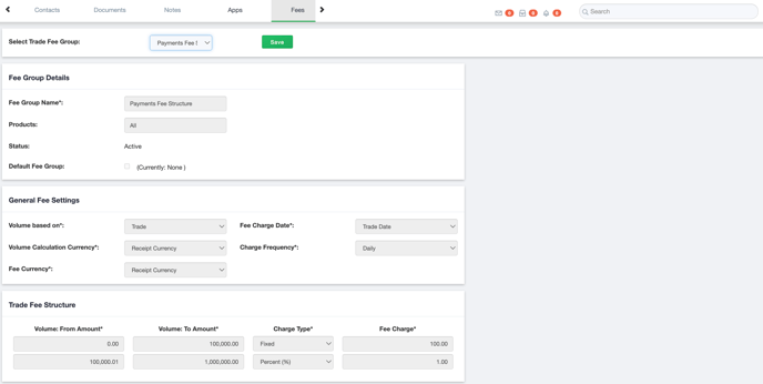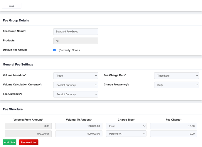 In the sample screenshot below, Standard Fee Group is the default fee structure to be used to charge all clients. Clients will be charged a fee/commission on each trade on the trade date, depending on the trade. The fee/commission amount will be either a fixed 15.00 if the trade amount is up to 100,000 or 2% of the trade amount if trade amount is over 100,000 in the currency that the client owes you.