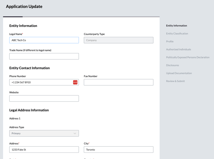 Once the application is submitted, the information can be reviewed by compliance by navigating to Compliance > Counterparties KYC in the left sidebar. Alternatively, you can search for the account by filtering the compliance status for Compliance Review - Onboarding and clicking on the counterparty name to view the information entered by the user.