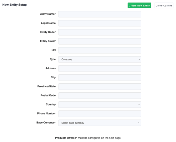 Alternatively, if you are creating multiple entities similar to the entity you are currently in, you can click on the Clone Current button. This button will auto-populate the fields based on the information available from your current entity.