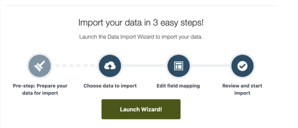 Start by navigating to Setup and searching for Data Import Wizard in the Quick Find bar. Open the Data Import Wizard and select Launch Wizard.