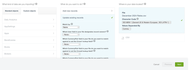 In this example, we’re updating the Accounting Rate for existing Currency Pair records, so you would select Update Existing Records. Prepare a CSV file with the updated data, ensuring the headers in the file match the fields you’re updating. Drag and drop the CSV file, then click Next to proceed.