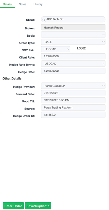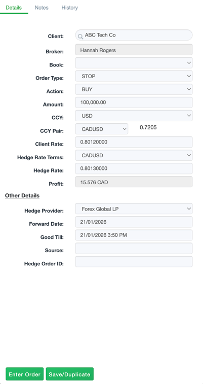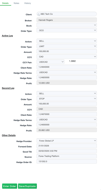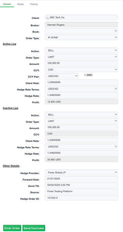 Profit - The profit on the order will automatically be calculated using the differences in the client rate and hedge rate.