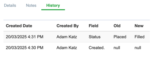 The history tab tracks changes made to the trade. This includes tracking what user made the change and at what time.