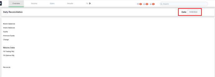 By default, the daily reconciliation page loads the current date. If you are accessing the page before the end of the current trading day, you will see an empty page.