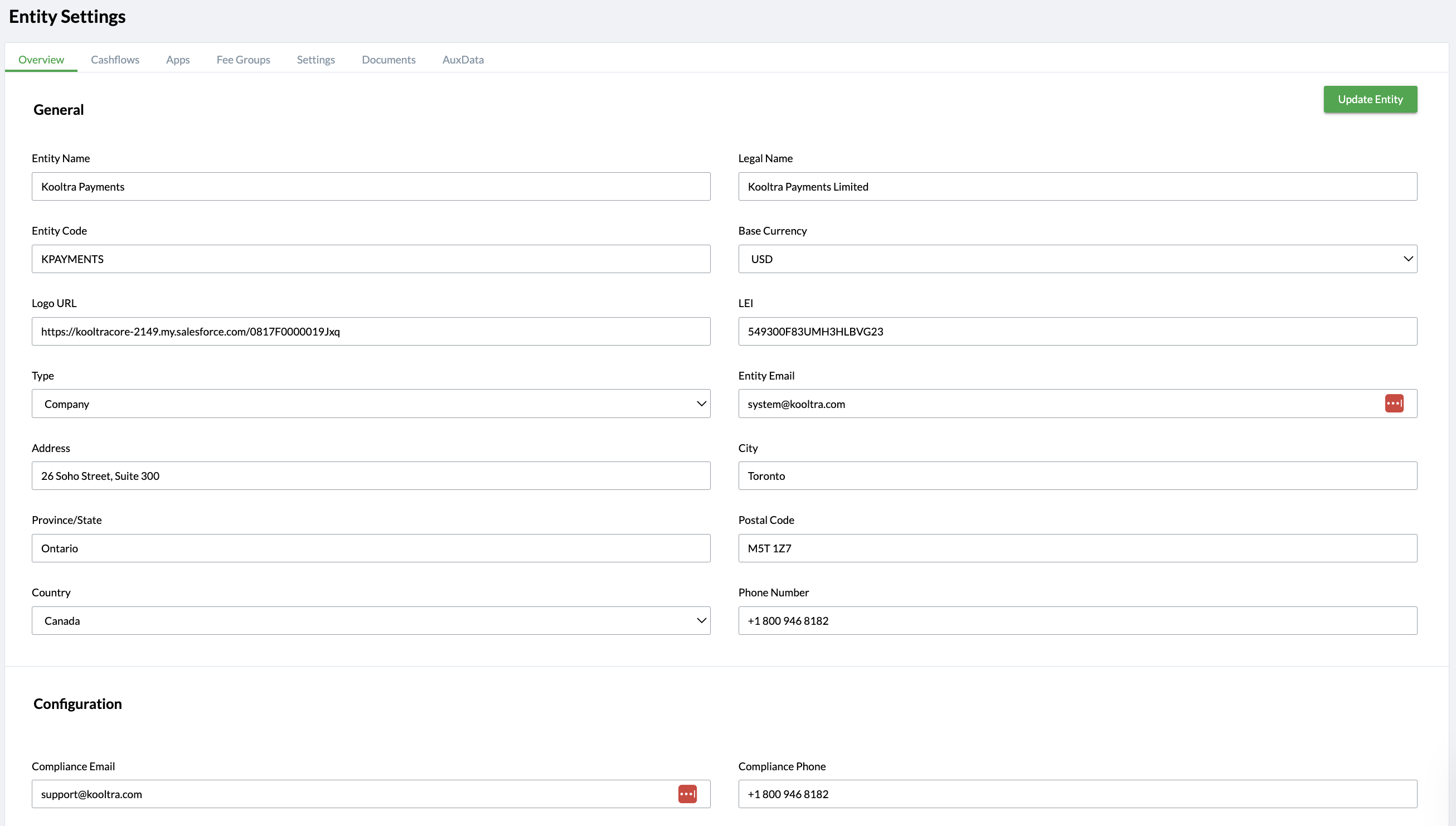 General Card: Displays the information entered on the New Entity page and allows you to add a Logo URL. This logo appears in PDF files generated from Kooltra (e.g., the FX Statements Report).