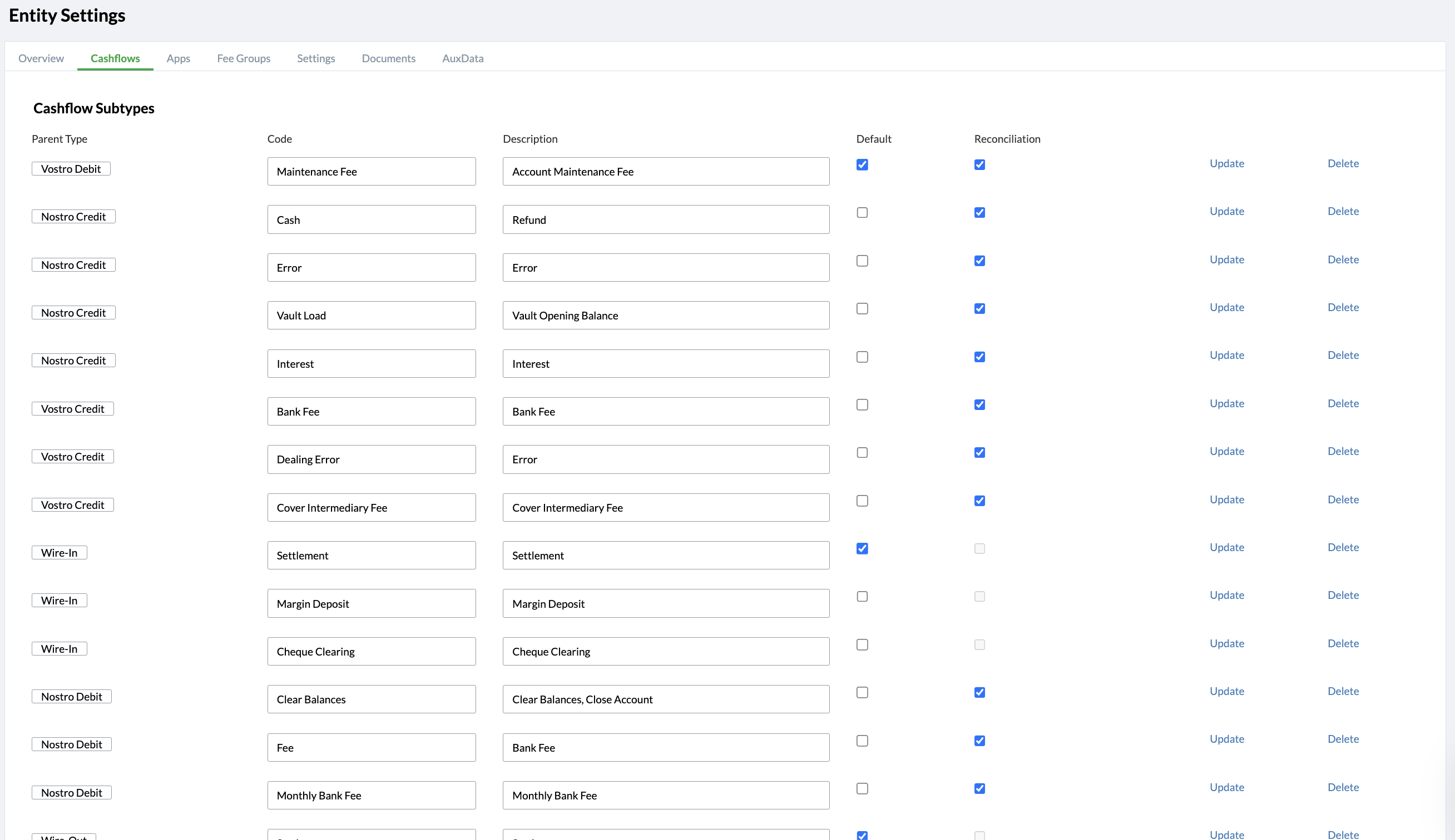 Cashflow subtypes can be updated or deleted by clicking on the blue Update or Delete text on the right-hand side of the Cashflow Subtypes card.