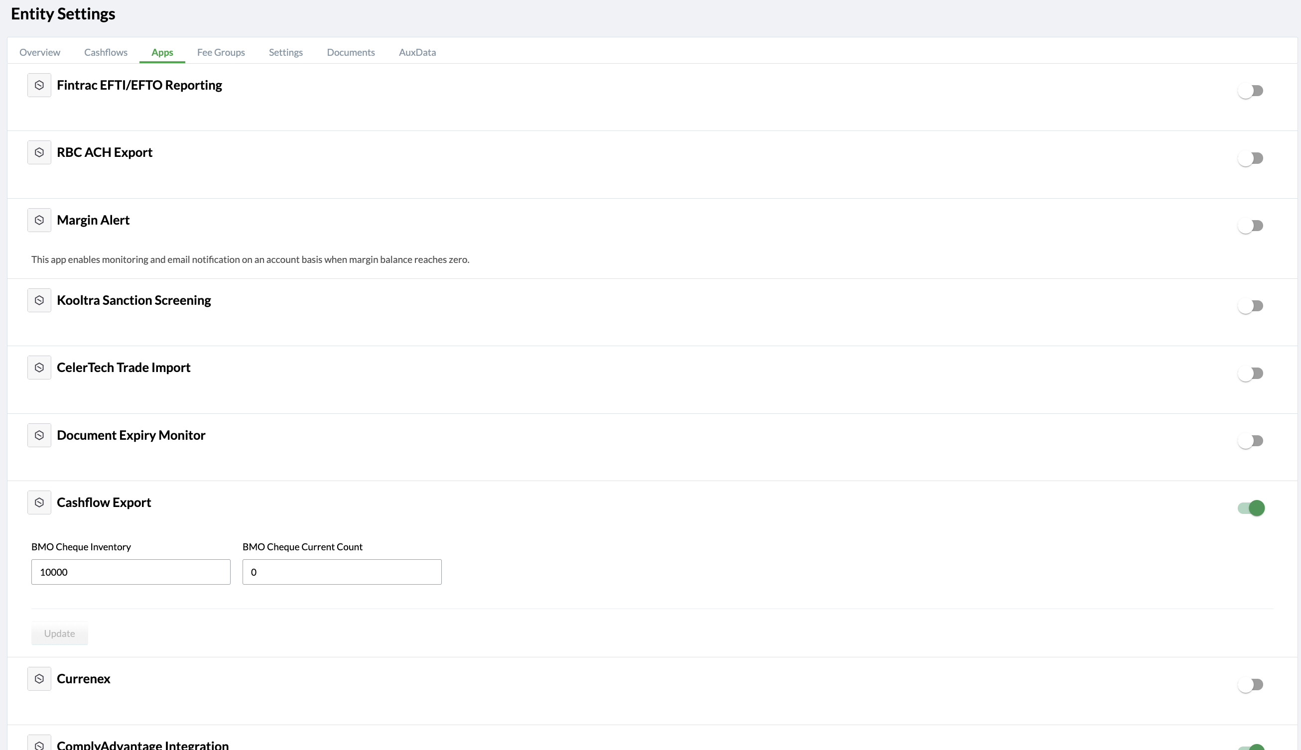 The Apps tab allows you to enable apps at the entity level. Certain apps must be enabled for an entity before they can be used for accounts within that entity. Use the toggle switch to enable or disable an app. Depending on the app, you may need to enter values in additional fields when enabling it.