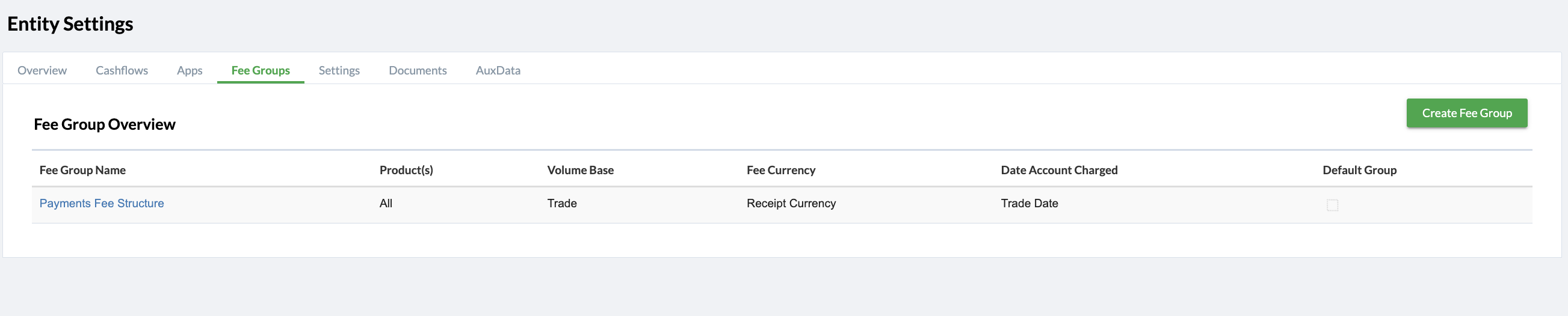 The fee groups tab allows you to set up a fee group at the entity level to automatically calculate the fee/commission charge on all trades on a client by client basis.