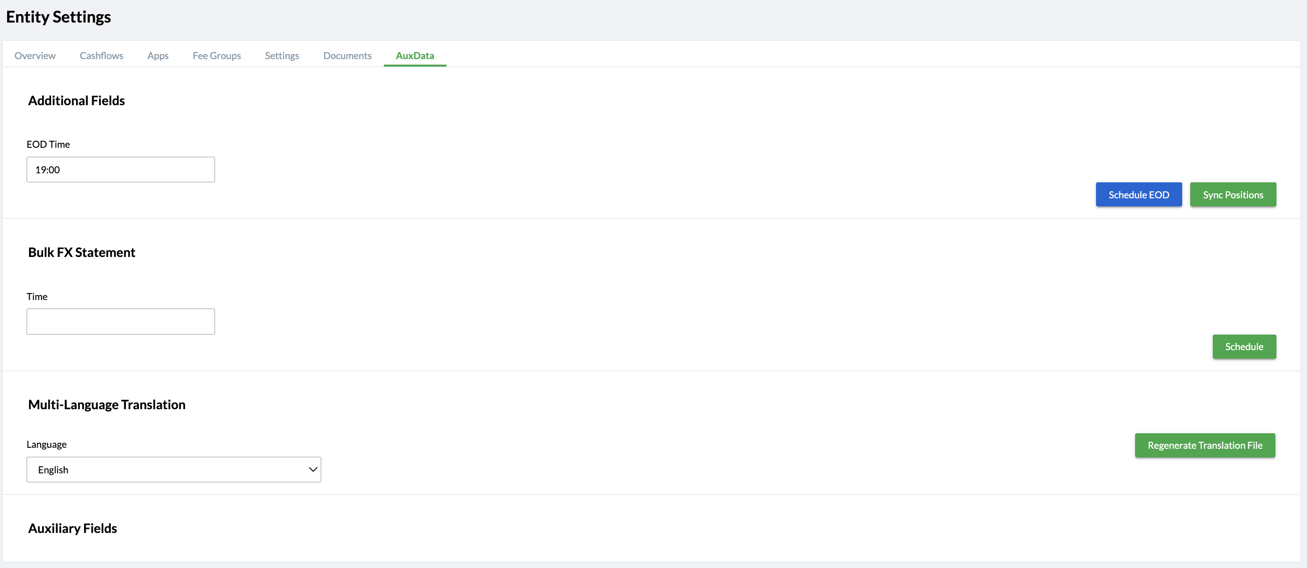 The Aux Data tab allows you to schedule end of day settlements by entering the time in the EOD Time field (24 hour format).
