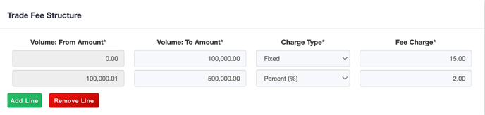 | Volume: From Amount | Mandatory – Fees/commissions amounts will be configured based on trade volume or trade amounts. You may charge a fee across all trade volume or create volume tiers to charge a different fee based on volume. This represents the start range of the tier. | ![]() |