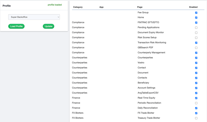 Once the profile is loaded, you can select or remove the pages the profile has access to by checking or unchecking the box next to each page name.