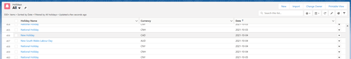 This will launch a list view of any recently viewed holidays. To see all holidays in the system, click on the downward arrow next to ‘Recently Viewed’ and select ‘All’.