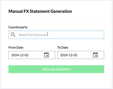 To manually generate a statement, access the FX Statements page, click on Reporting > FX Statements in the navigation panel.