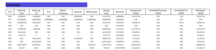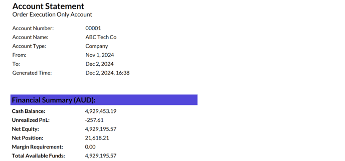 The first page of the statements provides an overview of key financial metrics in the entity's base currency (AUD in this example). These metrics include the cash balance, equity, net position, and margin requirements. Additionally, it includes an overview of cash movements for each of the client's Vostro accounts.