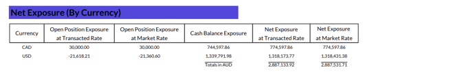 The Net Exposure (By Currency) section provides an overview of the net balances held by a counterparty for each traded currency, excluding the entity’s base currency, for the specified date range.