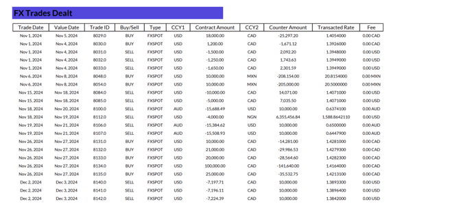 The FX Trades Dealt section displays a list of all trades that were executed during the specified date range of the statement.