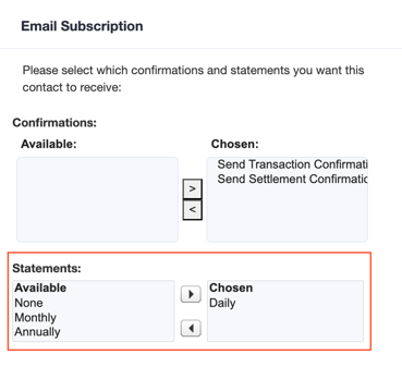In the Email Subscription card at the bottom of the Contact Overview page, select the desired frequency for statement generation and delivery—Daily, Monthly, or Annually. If "None" is selected, statements will not be emailed.