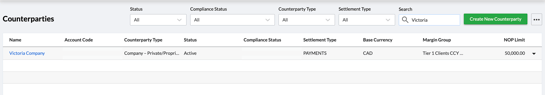 To automatically subscribe an account for statement delivery, navigate to Counterparties > Counterparties in the left navigation panel and use the local search bar to find the counterparty by name. Select the counterparty to open the overview page.