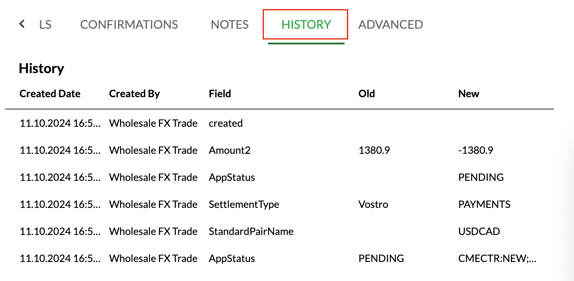 To view the trade history, navigate to the top of the trade ticket page, where you will find a menu. Use the arrow to access the "History" tab, where you'll find an audit log of all amendments made to the trade.