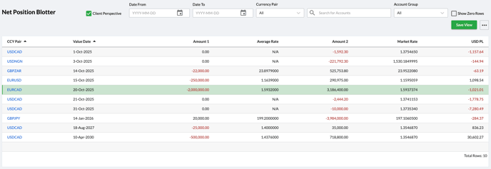 The Net Position Blotter (accessed via FX Blotters > Client Position Blotter on the navigation pane) shows the overall position of all trades specified within a value date. These positions can be filtered by value date, account, currency pair and account groups. By default, the Net Position Blotter shows the position in house perspective. However, users can change the blotter in client perspective by clicking on the “Client Perspective” box.
